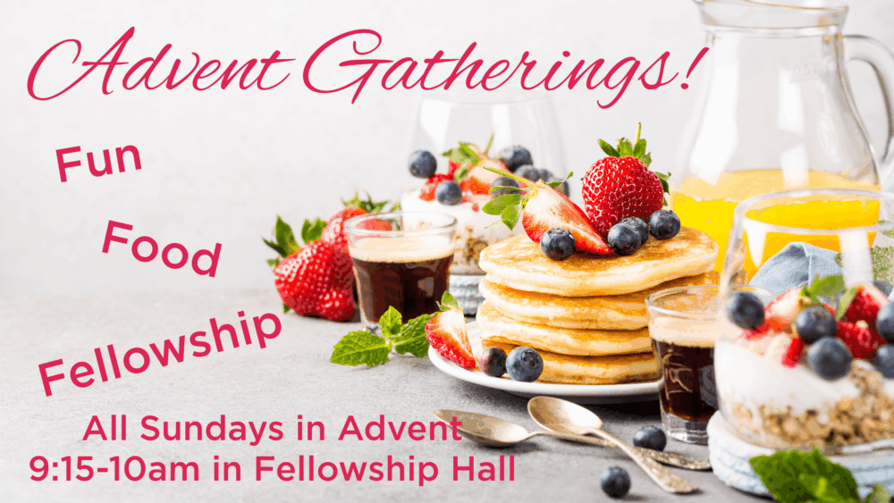 Join us every Advent Sunday (Nov 30, Dec 7, Dec 14 and Dec 21) for this delicious fellowship event in Fellowship Hall. All the food you can eat and lots of folks to talk to and spread Christmas cheer. Our Sunday School classes take turns hosting and providing all the food. Do Not Miss!