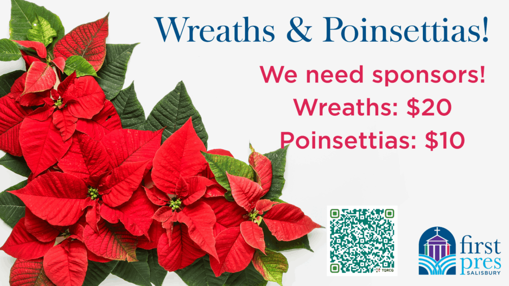 Tis the Season…we need lots of sponsors for our annual Christmas wreaths and poinsettias that we use to make our worship spaces beautiful for the Advent season. Please humbly consider donating to or sponsoring for this annual church need.  Wreaths are $20 each and poinsettias are $10. We have 23 wreaths and 100 poinsettias to dedicate to the honor or memory of someone you love.  Please call the church office (704-636-1321) or use this link to donate.